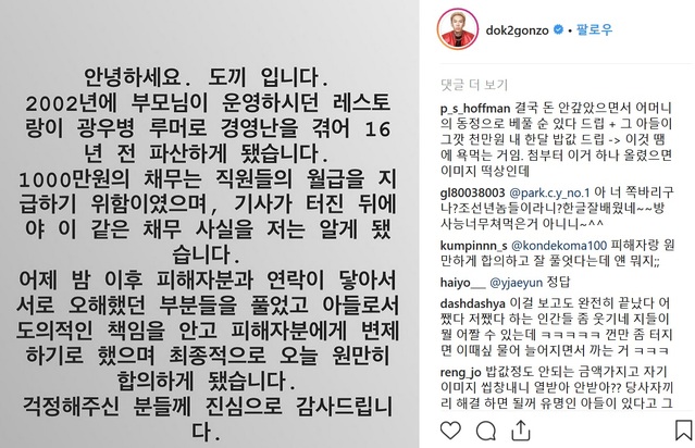 도끼는 자신의 인스타그램 계정을 통해 "2002년경 부모님이 운영하시던 레스토랑이 광우병 루머로 경영난을 겪어 파산한 적이 있었는데 이 일로 (대구에서 중학교를 같이 다닌 A씨로부터)1천만원의 채무를 지게 됐다"며 "이 빚은 직원들의 월급을 지급하기 위함이었고, 기사가 터진 뒤에야 이같은 채무 사실을 알게 됐다"고 밝혔다.