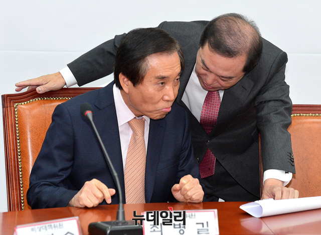 김병준 자유한국당 비상대책위원장과 최병길 의원이 28일 오전 국회에서 열린 비상대책위원회-중진의원 연석회의에 앞서 대화를 나누고 있다.