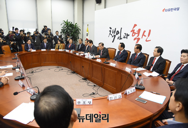 김병준 자유한국당 비상대책위원장이 28일 오전 국회에서 열린 비상대책위원회-중진의원 연석회의에 참석해 발언하고 있다.
