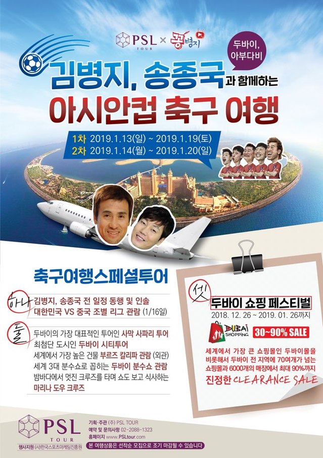 한국 축구의 ‘레전드’인 김병지와 송종국이 대규모 응원단을 이끌고, 2019년 AFC 아시안컵이 열리는 아부다비로 향한다. 팬들과 함께 대한민국 축구 대표팀의 승리를 기원하는 응원을 펼친다는 계획이다.김병지·송종국은 1월 16일(한국시간) 아부다비에서 개최되는 한국-중국전에, 축구 팬들로 구성된 응원단과 함께 참여한다.김병지는 “2018 자카르타 올림픽 축구 우승으로 새롭게 조성된 축구 열기를 계속 이어 나가기 위해 이번 행사에 참여했다”면서 “많은 팬들이 우리 대표팀의 승리를 위해 원정 응원에 동참해주길 바란다”고 말했다.한국스포츠마케팅진흥원이 두바이 원정 응원단을 모집 중이다. 진흥원 측은 “축구 경기 응원뿐만 아니라 두바이에서 열리는 쇼핑 페스티벌, 마리나 도우 크루즈 선상 만찬, 사막 사파리 투어 등 여행 프로그램도 마련돼 있다”고 했다. 4박 7일 일정으로, 모든 일정을 김병지와 송종국이 함께 한다.