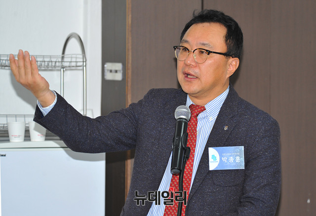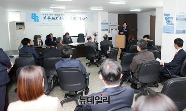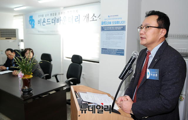 박종훈 비욘드더바운더리 이사장이 28일 오후 서울 중구 대도빌딩에서 열린 '비욘드더바운더리 개소식'에 참석해 인사말을 하고 있다.