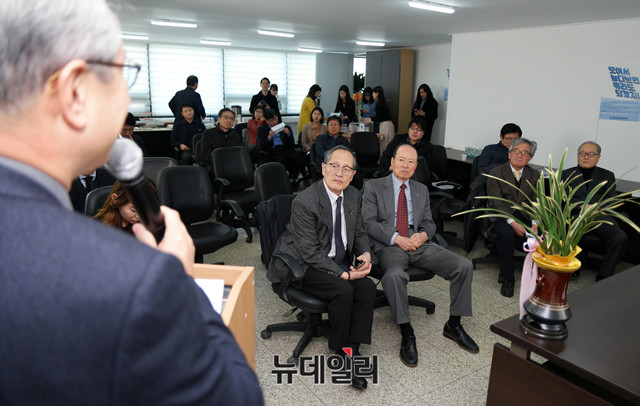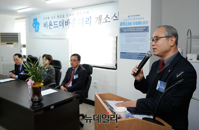 윤여상 북한인권정보센터 소장이 28일 오후 서울 중구 대도빌딩에서 열린 '비욘드더바운더리 개소식'에 참석해 경과보고를 하고 있다.