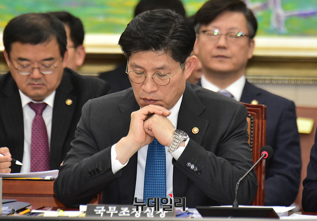 노형욱 국무조정실장이 28일 국회에서 열린 정무위원회 전체회의에 참석해 생각을 하고 있다.