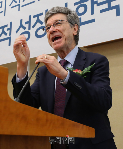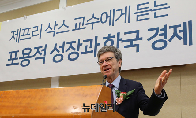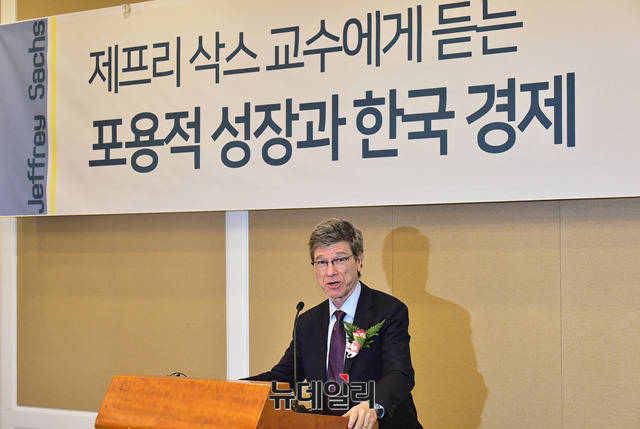 제프리 삭스 미국 컬럼비아대 경제학 교수가 28일 오후 국회 귀빈식당에서 '포용적 성장과 한국경제'를 주제로 강연하고 있다.