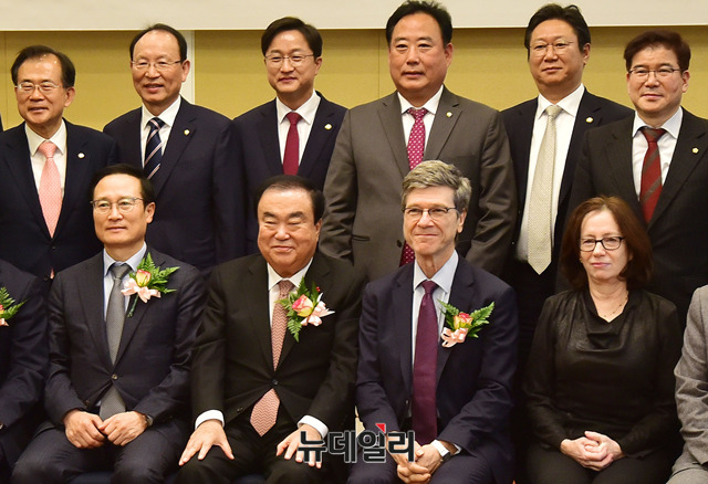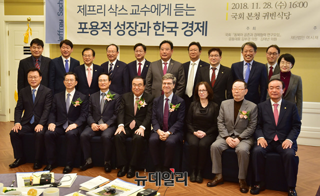 제프리 삭스 미국 컬럼비아대 경제학 교수가 28일 오후 국회 귀빈식당에서 '포용적 성장과 한국경제'를 주제로 강연을 하기에 앞서 문희상 국회의장, 홍영표 더불어민주당 원내대표, 장병완 민주평화당 원내대표 및 참석자들과 기념사진을 촬영하고 있다.