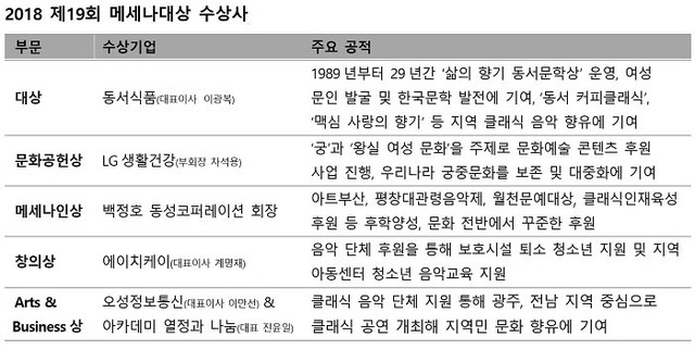 2018년 메세나대상은 문학, 전통문화 등 지원의 사각지대를 찾아 꾸준히 지원을 이어온 기업과 문화를 접하기 쉽지 않은 지역문화 향유를 위해 적극적으로 메세나 활동을 해온 기업들이 수상의 영광을 안았다.영예의 대상은 1989년부터 현재까지 29년간 '삶의 향기 동서문학상'을 운영해 한국문학 발전에 기여하고, 클래식 분야 후원을 지속해온 동서식품(대표이사·사장 이광복)이 선정됐다.1989년 시작된 동서문학상은 격년제로 개최되고 있으며, 국내 최대 규모이자 국내 유일의 여성 신인 문학상이다. 수상자에게는 상금과 함께 수상작을 '월간 문학'에 수록, 신인 여성 작가들에게 등단의 기회를 제공하고 있다.2008년부터 '동서 커피클래식'을 통해 전주, 춘천, 대구, 창원, 청주 등 지역주민을 위한 무료 클래식 공연을 펼쳐왔다. '동서 커피클래식'이 진행되는 지역의 어린이 오케스트라를 선정해 악기와 연습실을 지원하고 전문 음악인과의 마스터클래스를 지원하는 '맥심 사랑의 향기'를 병행하고 있다.아울러 '문화공헌상' LG생활건강(대표이사·부회장 차석용), '메세나인상' 백정호 동성코퍼레이션 회장, '창의상' 에이치케이(HK/대표이사 계명재), 'Arts & Business상' 오성정보통신(대표이사 이만선)·아카데미 열정과 나눔(대표 진윤일)이 수상사의 이름을 올렸다.[사진=한국메세나협회]