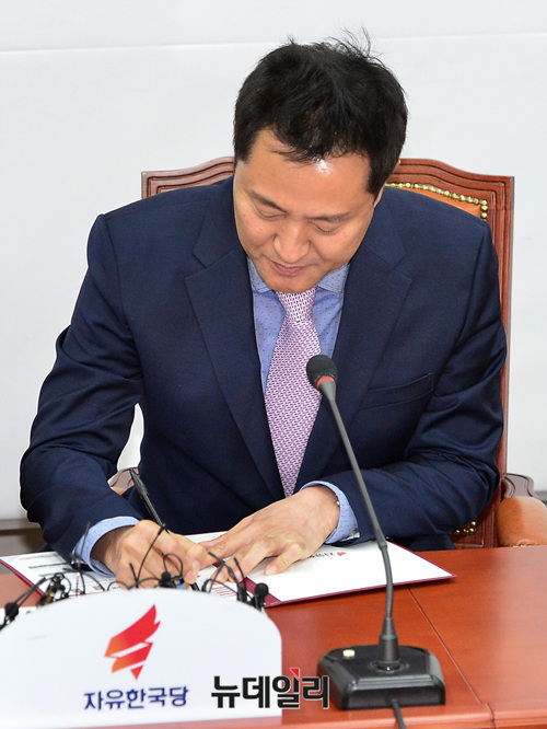 오세훈 전 서울시장이 29일 오전 국회에서 열린 자유한국당 비상대책위원회의 후 입당원서를 작성하고 있다.