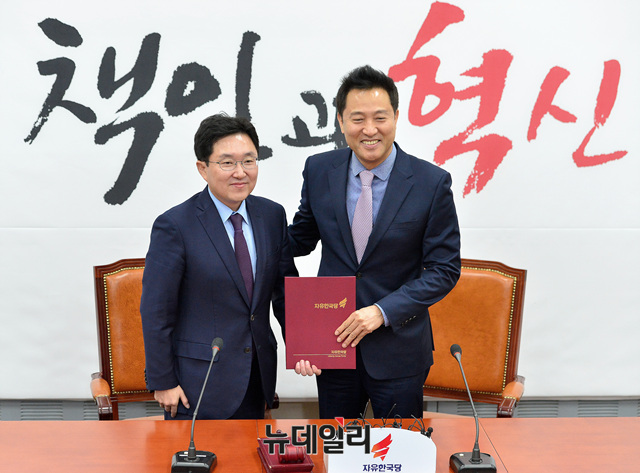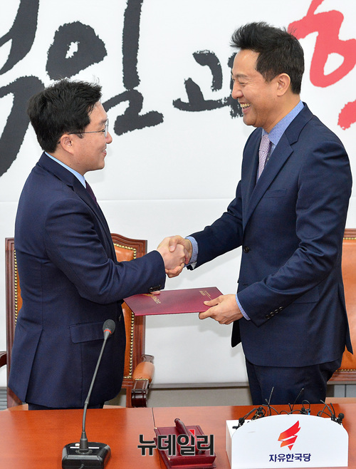 오세훈 전 서울시장이 29일 오전 국회에서 자유한국당 입당원서를 작성한 후 김용태 사무총장에게 전달하고 있다.