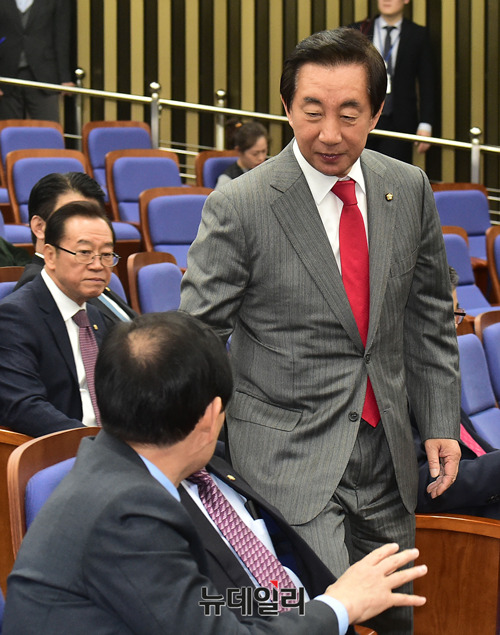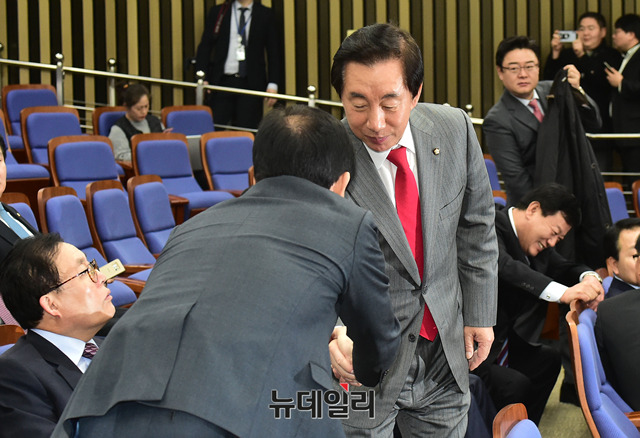 김성태 자유한국당 원내대표가 29일 오후 국회에서 열린 의원총회에서 의원들과 악수를 나누고 있다.
