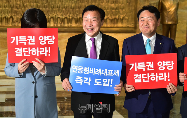 이정미 정의당 대표, 손학규 바른미래당 대표, 김관영 원내대표가 29일 오후 국회 본회의장 앞에서 열린 연동형 비례대표제 도입을 촉구 피켓시위에서 환하게 웃고 있다.