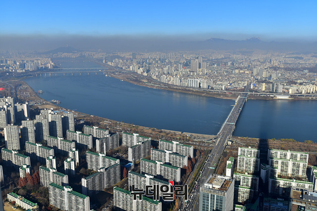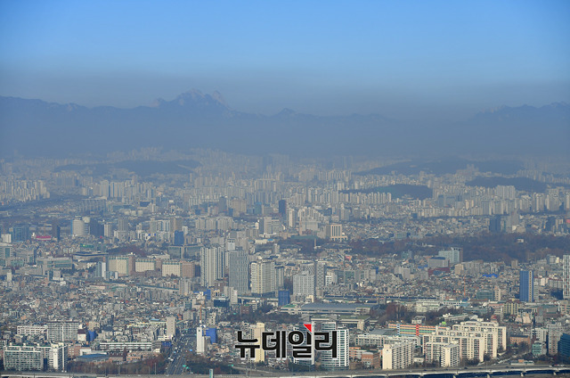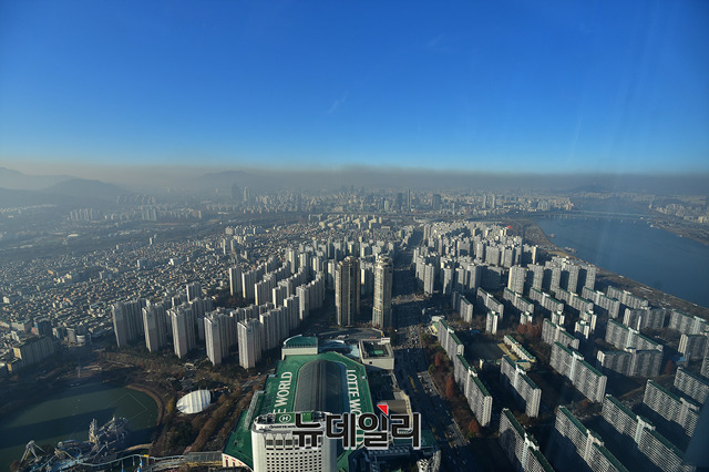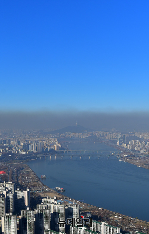 엿새째 미세먼지가 기승을 부리는 30일 오전 서울 송파구 롯데월드타워에서 본 서울 전경. 파란하늘 아래 미세먼지층이 뚜렷하게 보인다.
