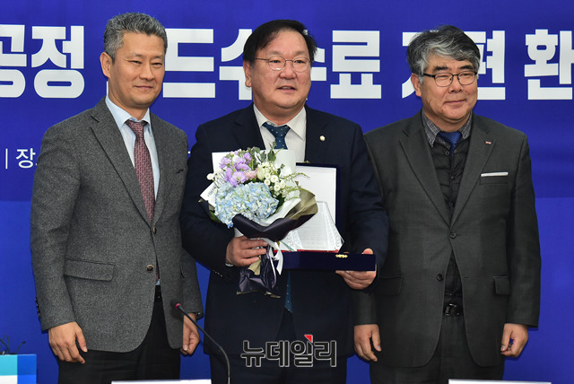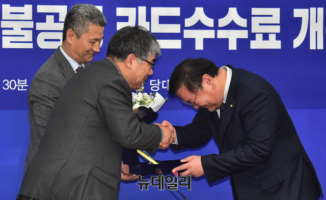 김태년 더불어민주당 정책위 의장이 30일 오전 국회에서 열린 '민생연석회의 불공정 카드수수료 개편 환영식'에서 감사패를 받고 있다.