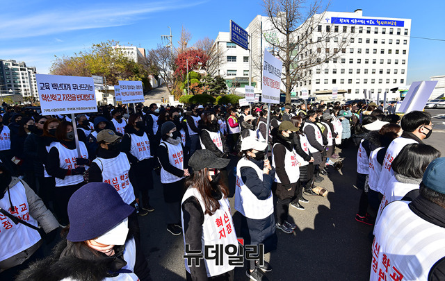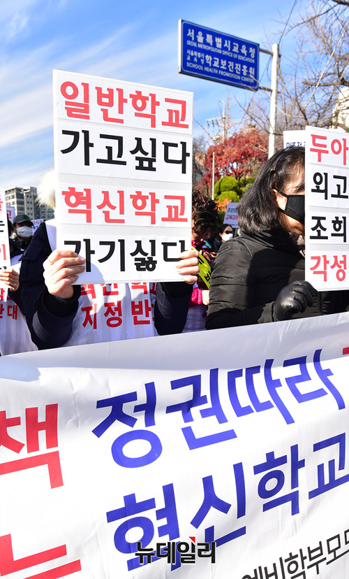 가락초 해누리초·중 예비학부모회와 헬리오시티입주협의회 회원들이 30일 오후 서울 종로구 서울시교육청 앞에서 혁신학교 임의지정과 관련해 기자회견을 열고 혁신학교 지정을 규탄하는 손피켓을 들고 집회에 참가하고 있다.