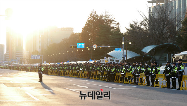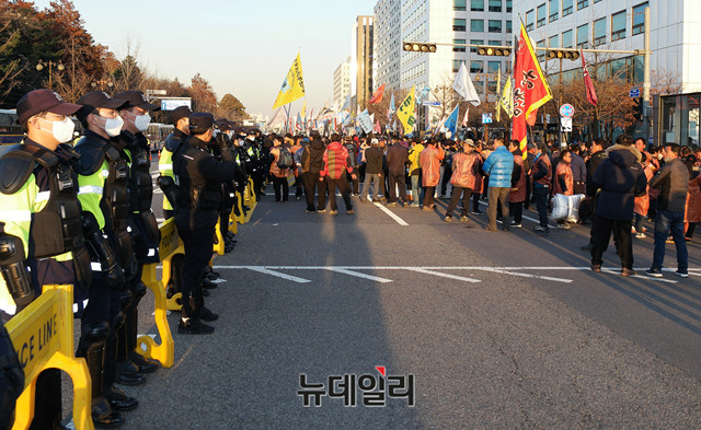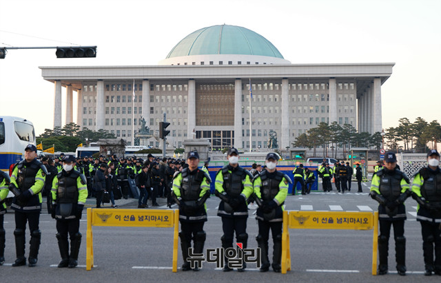 경찰들이 1일 오후 서울 여의도 국회 앞에서 열린 '2018 전국민중대회'에서 만약의 사태를 대비해 국회를 경비하고 있다.