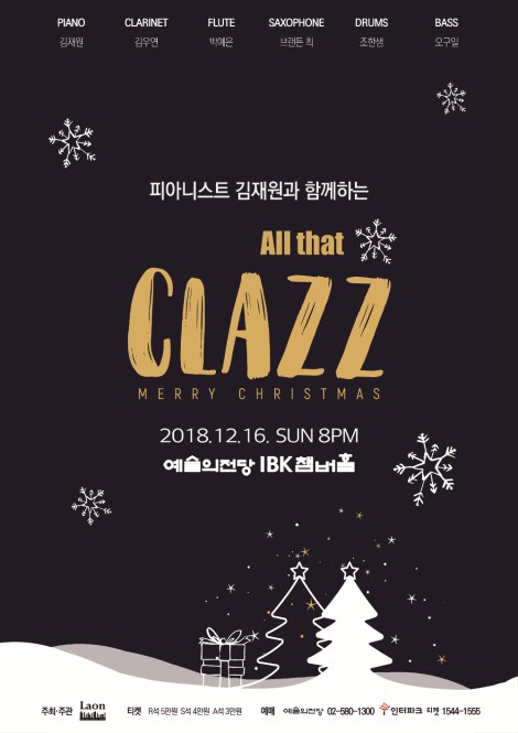 젊은 실내악단 '클럽M'을 기획한 피아니스트 김재원이 새로운 도전에 나선다.김재원은 1년이 넘게 심혈을 기울여 '올 댓 클래즈'를 런칭하고, 오는 16일 오후 8시 예술의전당 UBK챔버홀에서 첫 번째 공연을 개최한다.클래식과 재즈의 합성어인 '클래즈'는 두 장르를 넘나드는 다양한 프로그램과 연주자들을 구성해 대중에게 보다 친근하고 즐겁게 공연을 선보일 예정이다.이번 '올 댓 클래즈-메리크리스마스' 공연에는 김재원을 필두로 클라리넷 김우연, 플루트 박예은, 색소폰 브랜든 최, 콘트라베이스 오구일, 재즈 드럼 조한샘이 무대에 오른다.이날 '렛 잇 스노우(Let it snow)'를 시작으로 볼링 '아일랜드 소녀', 게닌 '베니스 사육제', 루터 '고풍 모음곡', 거슈윈 '클라리넷을 위한 3개의 전주곡', 호로비츠 '클라리넷과 피아노를 위한 소나타' 등과 김재원의 자작곡 '첫 눈(First Snow)'을 들려준다.'올 댓 클래즈 – 메리크리스마스'의 티켓은 인터파크와 예술의전당 홈페이지에서 예매할 수 있다.[사진=라온매니지먼트]