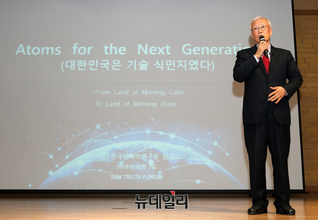 장인순 전 한국원자력연구원장이 3일 오후 서울대학교 가온홀에서 열린 서울대 트루스포럼(Truth Forum)에 참석해 '다음 세대를 위한 원자력'을 주제로 강의하고 있다.