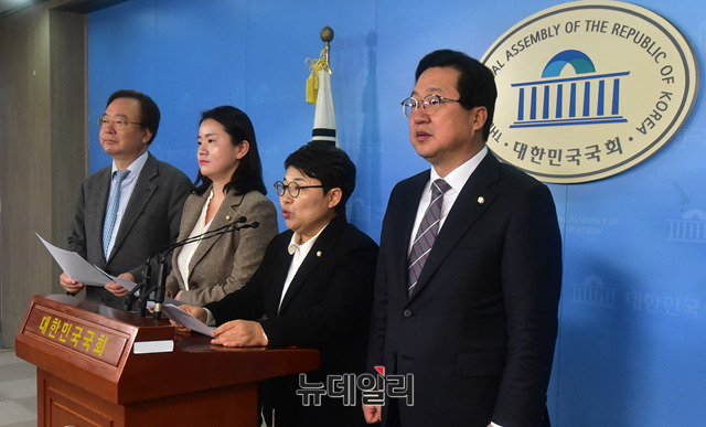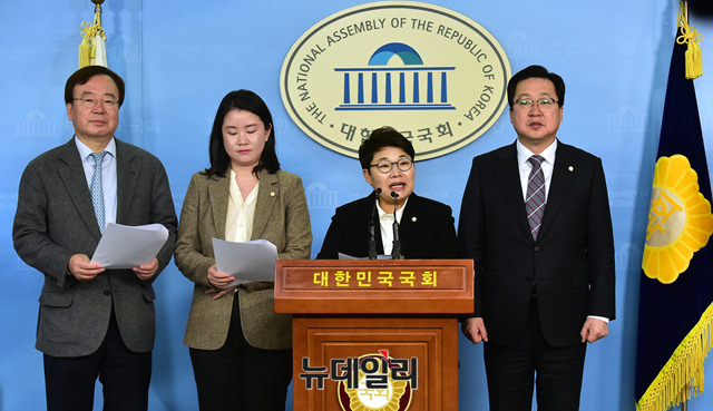 환경노동위원회 소속 자유한국당 의원들이 4일 오전 국회 정론관에서 현안 관련 기자회견을 하고 있다. (왼쪽부터 강효상, 신보라, 임이자, 이장우 의원)