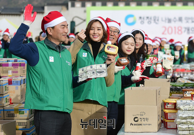 배우 김성령이 5일 오전 서울 광화문 북광장에서 열린 '청정원 나눌수록 맛있는 2,018개의 행복' 나눔 행사에서 인사말을 하고 있다. 김성령은 청정원 카레여왕의 광고 모델로 활동중이다.올해로 12회를 맞는 나눔 행사에는 임정배 대표, 광고모델 김성령을 비롯해 청정원 주부봉사단, 대학생 봉사단 등 약 250여 명의 자원봉사자들이 참석했다.참가자들은 대상㈜의 장류와 조미료, 홍초, 카레여왕, 파스타소스 등 총 27종의 식료품으로 구성된 나눔박스를 직접 포장했다. 나눔 박스는 서울시사회복지협의회 광역푸드뱅크센터를 통해 전국 소외계층에 전달된다.