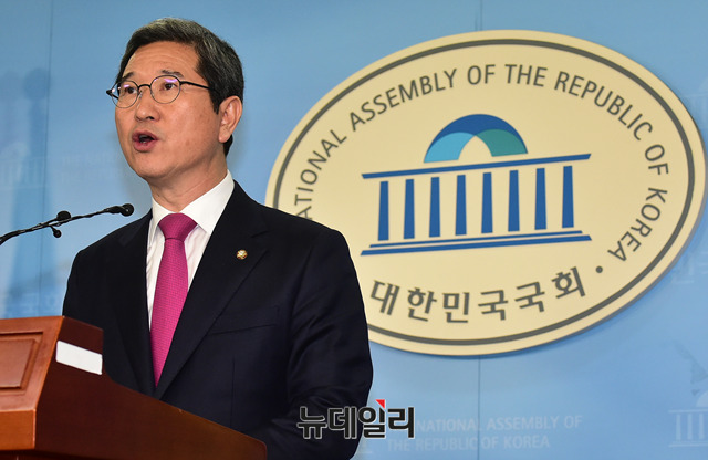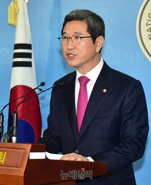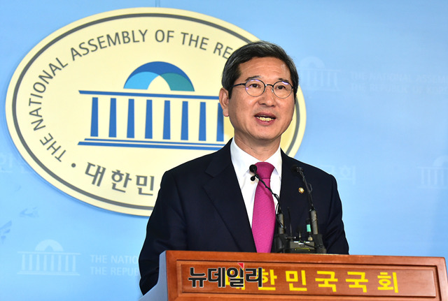 김학용 자유한국당 의원이 5일 오전 국회 정론관에서 원내대표 출마를 선언하고 있다.