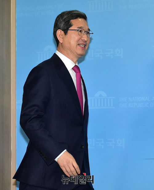 김학용 자유한국당 의원이 5일 오전 국회 정론관에서 원내대표 출마선언을 위해 입장하고있다.