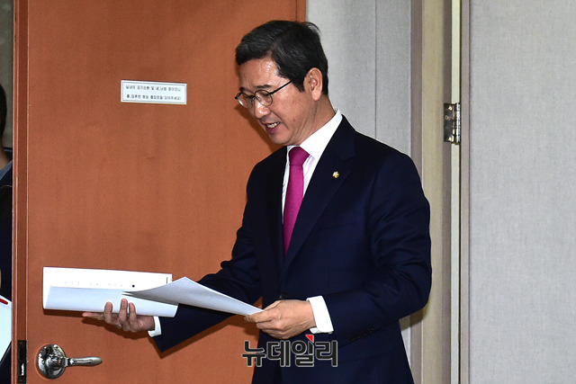 [포토] 정론관으로 들어서는 김학용 의원