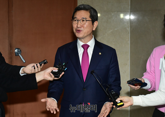 [포토] 기자들의 질문에 답하는 김학용 의원