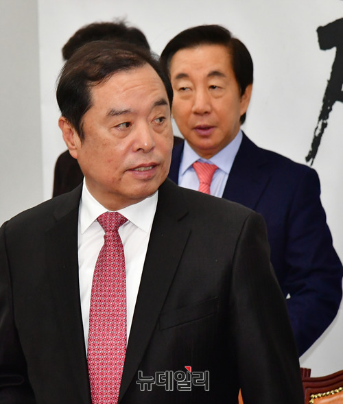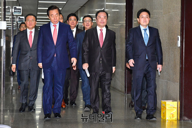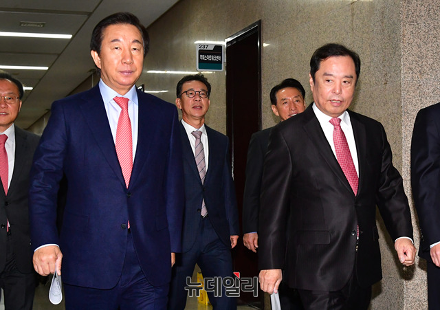 김병준 자유한국당 비상대책위원장과 김성태 원내대표 등 당직자들이 6일 오전 국회에서 열린 비상대책위원회의에서 참석하기 위해 입장하고 있다.