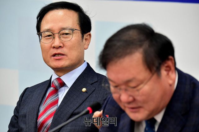 홍영표 더불어민주당 원내대표와 김태년 정책위 의장이 6일 오전 국회에서 열린 정책조정회의에서 대화를 나누고 있다.