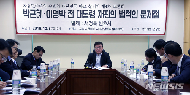 자유한국당 일각에서 박근혜·이명박 전 대통령의 무리한 구속 재판에 대한 문제를 제기했다.윤상현 한국당 의원은 6일 오전 국회 의원회관에서 '박근혜·이명박 전 대통령 재판의 법적인 문제점'이란 주제로 토론회를 열었다.토론회에는 한국당 김상훈·나경원·박맹우·여상규·유기준·이완영·이철규·이헌승·정양석·주호영 의원과 무소속 정태옥 의원이 참석했다. 대한애국당 법률고문인 서정욱 변호사가 발제를 맡았다.윤상현 의원은 "박근혜 전 대통령과 이명박 전 대통령이 구속된 지 시간이 많이 흘렀다"며 "증거인멸과 도주의 우려가 없는데도 무조건 구속부터 시켜놓고 재판을 진행한다"고 지적했다.그는 "두 분 전직 대통령에 대한 구속은 '적폐청산'이라는 미명하에 인권과 법치의 근간을 무너뜨린 정치재판이자 정치보복"이라며 "두 분 전직 대통령을 즉각 석방해서 공정하고 인권이 있는 재판이 되게 해야 한다"고 주장했다.공천개입건과 관련 '2년' 선고…죄형법정주의 위반서정욱 변호사는 "검찰이 한꺼번에 영장을 청구했다면 (박근혜 전 대통령은) 만기로 석방돼 불구속 재판을 받았을 것"이라며 "그런데 구속기간이 만료되면 (검찰이) 또 다른 혐의로 (영장을) 청구해서 구속기간을 늘렸다"고 비판했다.서 변호사는 "검찰과 특검은 박 전 대통령의 모든 혐의에 대해 충분히 조사해 한번에 기소하지 않고 계속 추가기소를 했고, 법원의 경우 충분히 병합심리가 가능함에도 분리심리를 하여 양형이나 구속기간의 제한에 있어 피고인에게 엄청난 법적 불이익을 준 것"이라고 설명했다.서 변호사는주 4회 재판과 관련해서는 "저는 일주일에 네 번씩 재판 하는 것을 외국에서도 본적이 없다"며 "거의 매일 재판을 하면 변호사의 방어권에도 문제가 생긴다"고 했다.이어 "졸속재판과 신속재판을 구분해야 한다"며 "전직 대통령이라고 해서 재판과정에 어떠한 특혜가 있어서도 안 되지만, 역으로 전직 대통령이라는 이유만으로 어떠한 차별을 받아서는 안 된다"고 덧붙였다.또 "박 전 대통령의 최종형량이 33년이 나오는데 과거 노태우 전 대통령을 비교해보면 노 전 대통령은 12·12와 5·18 관련해서 군사반란과, 내란중요임무종사 등의 혐의였고, 직접 받은 뇌물이 2700억원인데도 최종 17년을 선고 받았다"면서 "그런데 박 전 대통령은 10원도 직접 안 받았는데 어떻게 33년형이 될 수 있느냐"고 지적했다.그는 "박 전 대통령 총선 공천개입건과 관련해 법원이 2년을 선고하고 최종 확정한 것은 명백히 죄형법정주의 위반이다"라며 "과거 역대 대통령은 집권당의 대표를 겸직했고, 박근혜 전 대통령도 1호 당원으로 가장 많은 당비를 납부했는데 왜 당내 공천에 관여할 수 없느냐"고 물었다.또 "역대 대통령 중 청와대가 공천에 개입하지 않은 경우가 한 번이라도 있었느냐"고 반문하며 "박근혜 전 대통령이 공천에 관여했다는 이유로 실형까지 선고받은 것은 현 정권에게도 큰 정치적 부담이 될 것"이라고 강조했다."전직 대통령이란 이유로 '비정상' 재판 받아"한국당 소속 여상규 법사위원장은 "지금 두 전직 대통령에 대한 재판은 정상적인 절차로 진행되지 않는 것 같다"며 "문재인 대통령이 촛불에 의해 집권을 시작한 시점부터 우리가 지향해야 할 실질적 법치는 완전히 실종됐다"고 지적했다.같은 당 주호영 의원도 "문재인 대통령은 인권변호사 출신이라면서 이렇게 심각한 헌법위반, 절차위반을 뭉개고 간다는 점에서 인격이 의심스러운 상황까지 왔다"며 "당에서 적극 대처했으면 좋겠다"라고 강조했다.한편 유상현 의원은 토론회 직후 기자들과 만나 김무성 의원과 추진하고 있는 '박근혜 전 대통령 불구속 재판 촉구 결의안'에 대해 "김무성 의원이 만드는 게 아니라 대한민국을 걱정하는 지도자 몇 분이 만들고 있다"고 설명했다.