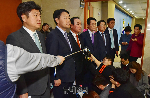 연동형 비례대표제를 주장하는 바른미래당-민주평화당-정의당 야3당 원내대표단이 6일 오후 국회 정론관에서 더불어민주당과 자유한국당이 내년도 예산안 잠정 합의에 대한 규탄기자회견을 마치고 기자들의 질문에 답하고 있다.