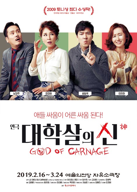 남경주·최정원·이지하·송일국이 2년여 만에 연극 '대학살의 신'으로 다시 뭉친다.2017년 객석점유율 96%를 기록한 '대학살의 신'은 연극 '아트'로 잘 알려진 프랑스 작가 야스미나 레자가 쓴 작품이다. 2009년 토니 어워즈, 올리비에 어워즈, 2010년 대한민국 연극대상 등 권위 있는 시상식에서 주요 부문의 상을 거머쥐었다.다소 살벌한 제목에 반해 철저히 치고받는 대사만으로 다양한 갈등의 변주를 드러내며, 부부간의 소소한 논쟁을 통해 중산층의 허위의식과 소통의 부재를 다룬다. 4명의 배우는 교양이라는 가면 안에 가려져 있던 우리 모두의 민낯을 사이다처럼 시원하게 까발리며 우아하고 품격 있게 망가진다.이야기는 11살 두 소년이 놀이터에서 싸우다 한 소년의 이빨 두 개가 부러지는 사고가 발생, 때린 소년의 부모인 알렝(남경주)·아네뜨(최정원)가 맞은 소년의 부모인 미셸(송일국)·베로니끄(이지하)의 집을 찾아오면서 시작된다.처음 고상하고 예의를 지키던 두 부부의 대화는 점점 유치한 설전으로 변질되고, 이들의 설전은 가해자 부부와 피해자 부부의 대립에서 엉뚱하게도 남편과 아내, 남자와 여자의 대립으로 이어지고 결국에는 눈물 섞인 진흙탕 싸움으로 치닫는다.송일국은 "만약 철드는 과정 없이 그대로 자랐다면 미셸 같은 사람이 됐을 것 같다. 그만큼 비슷한 점이 많다. 작품 안에서 풀어지는 연기는 처음이라 쉽지 않았지만 관객을 처음 만난 첫 공연은 잊지 못할 순간이다. 자연스럽게 새로운 것에 대한 자신감을 갖게 해준 고마운 작품이다"고 전했다.연극 '대학살의 신'은 2019년 2월 16일부터 3월 24일까지 예술의전당 자유소극장에서 공연되며, 오는 13일 티켓 오픈을 진행한다.[사진=신시컴퍼니]