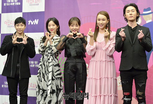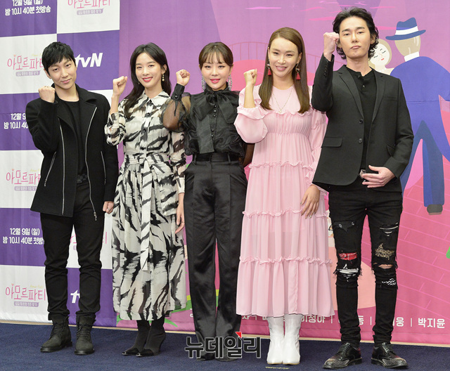 예능 프로그램 '아모르파티'의 출연자들(나르샤, 허지웅, 하휘동, 배윤정, 이청하)이 7일 오전 서울 마포구 스탠포드호텔에서 열린 제작발표회에 참석해 포즈를 취하고 있다.