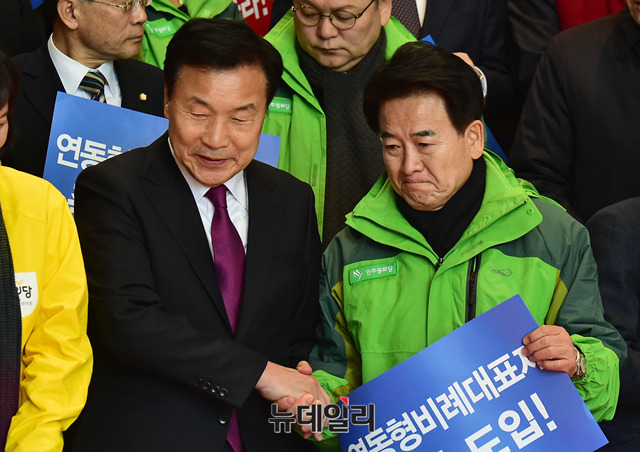 손학규 바른미래당 대표와 정동영 민주평화당 대표가 7일 오전 국회 본청 로텐더홀 계단에서 거대양당 규탄대회에서 인사를 나누고 있다.