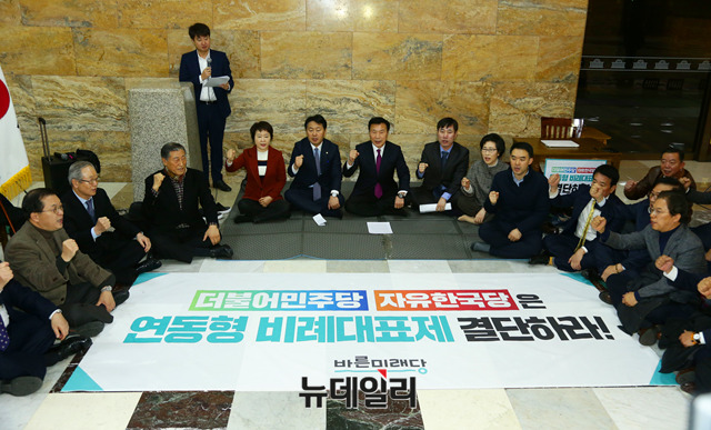 손학규 바른비래당 대표와 김관영 원내대표 및 참석자들이 7일 오전 국회 로텐더홀에서 열린 거대양당 야합 규탄대회에서 구호를 외치고 있다.