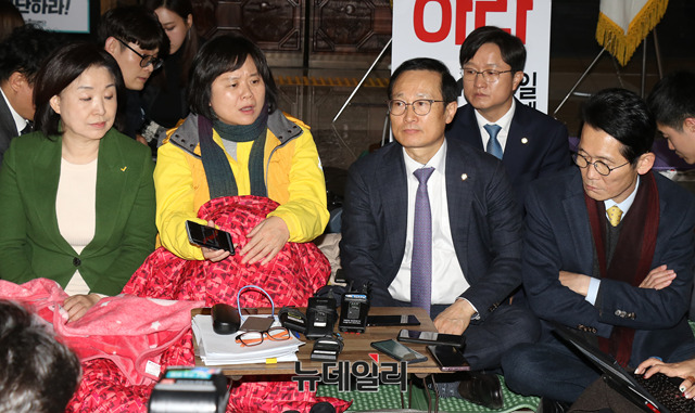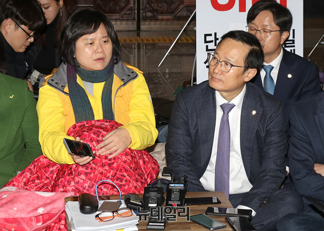 홍영표 더불어민주당 원내대표가 7일 국회 로텐더홀에서 단식농성 중인 이정미 정의당 대표를 찾아 대화를 나누고 있다.