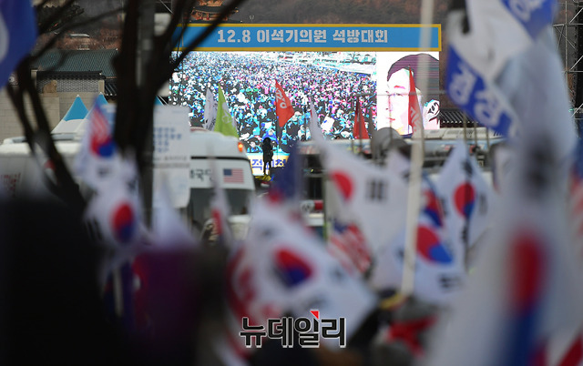 [포토] 태극기 사이로 보이는 이석기 석방대회