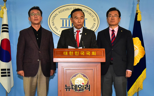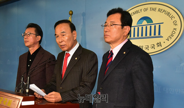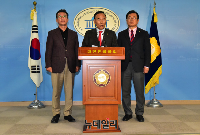 자유한국당 국회 국토교통위원회 소속 박덕흠, 홍철호, 이현재 의원이 10일 오전 국회 정론관에서 강릉 KTX탈선 사고 관련 긴급기자회견을 하고 있다.