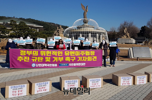 이들은 "정부가 책임져야 할 것은 세계 난민과 이주 외국인이 아니라 바로 우리 국민들"이라며 "유엔 이주협정에 한국이 참여하게 되면, 대규모 난민과 불법 이민자들이 몰려들 것이며 그들과 복지·일자리를 두고 한국 내 취약계층들의 삶은 더욱 피폐해질 것이다. 이는 국토 수호를 포기한 각서"라고 주장했다.