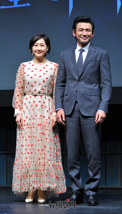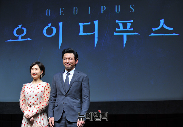 배우 배해선, 황정민이 11일 오후 서울 용산구 블루스퀘어 카오스홀에서 열린 연극 '오이디푸스' 제작발표회에 참석해 포토타임을 갖고 있다.