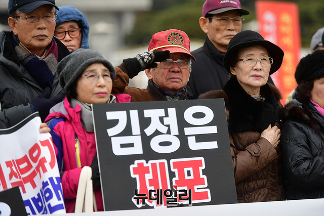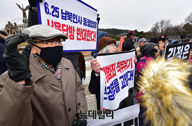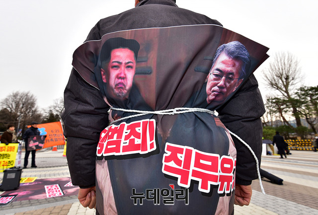 6.25전쟁납북인사가족협의회 회원이 11일 오후 청와대 앞 분수대에서 열린 긴급기자회견에서 '김정은 체포'를 촉구하는 손피켓을 들고 자리하고 있다.