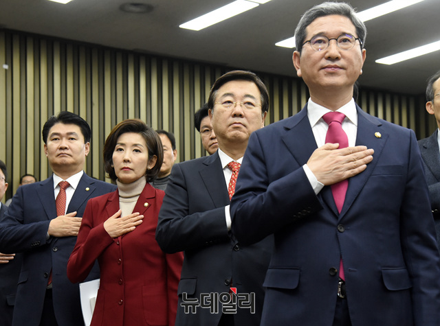자유한국당 원내대표 후보인 김학용, 나경원 의원과 정책위의장 후보 김종석, 정용기 의원이 11일 오후 국회에서 열린 원내대표 및 정책위의장 선출 의원총회에 참석해 국민의례를 하고 있다.