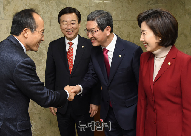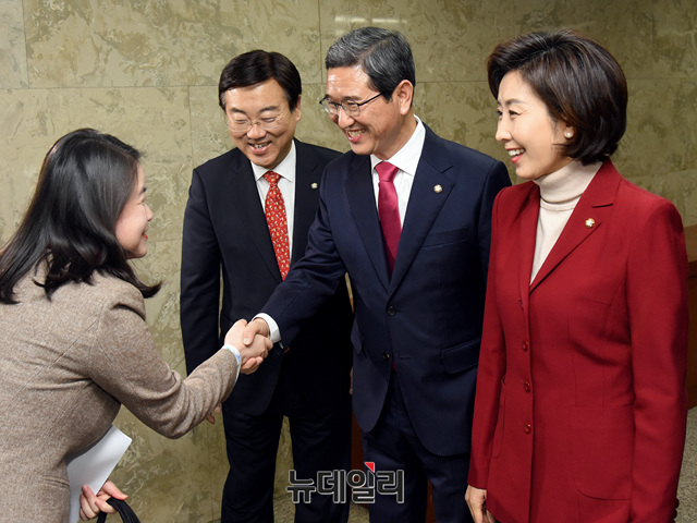 자유한국당 원내대표 후보인 김학용, 나경원 의원과 정책위의장 후보 김종석, 정용기 의원이 11일 오후 국회에서 열린 원내대표 및 정책위의장 선출 의원총회에 참석해 의원들과 악수를 나누고 있다.