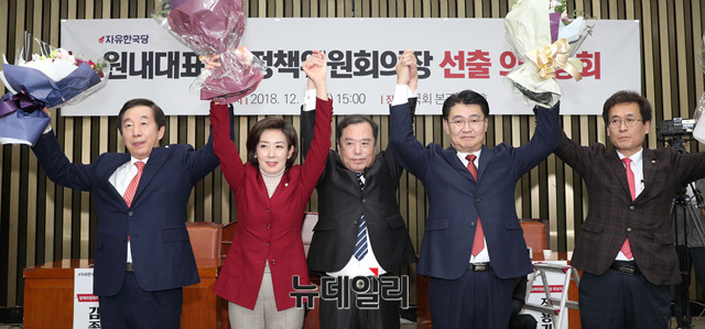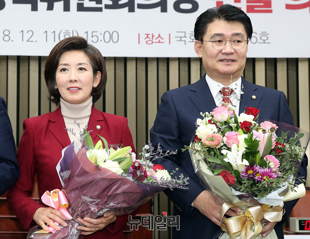 나경원 자유한국당 신임 원내대표와 정용기 신임 정책위의장이 11일 오후 국회에서 열린 원내대표 및 정책위의장 선출 의원총회에서 당선 발표 후 꽃다발을 들고 있다. 이날 나 신임 원내대표는 총 103표 중 68표를 득표했다.