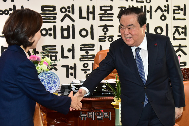 문희상 국회의장이 12일 오전 국회 의장실을 예방한 나경원 신임 자유한국당 원내대표와 인사를 하고 있다.
