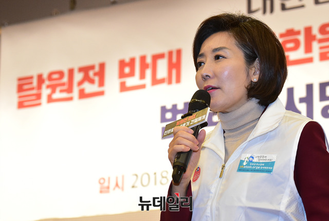 나경원 자유한국당 원내대표가 13일 오후 국회 도서관 대강당에서 열린 '탈원전 반대 및 신한울 3·4호기 건설재개 범국민 서명운동본부 발대식'에서 축사를 하고 있다.