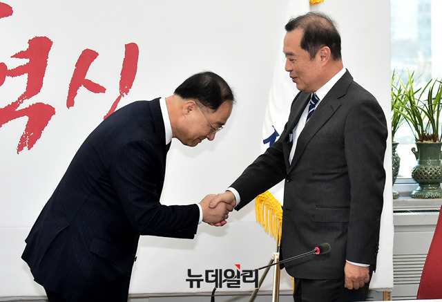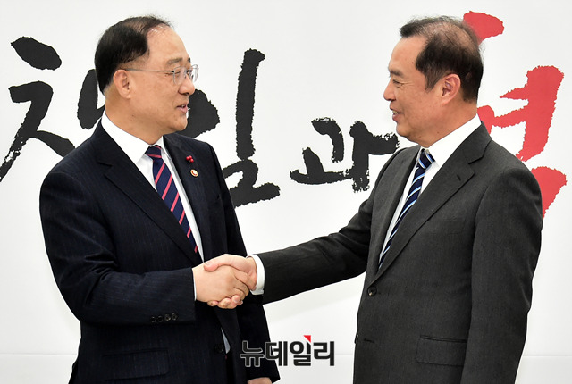 홍남기 신임 경제부총리 겸 기획재정부 장관이 13일 오후 국회를 찾아 김병준 자유한국당 비대위원장을 예방해 인사를 나누고 있다.