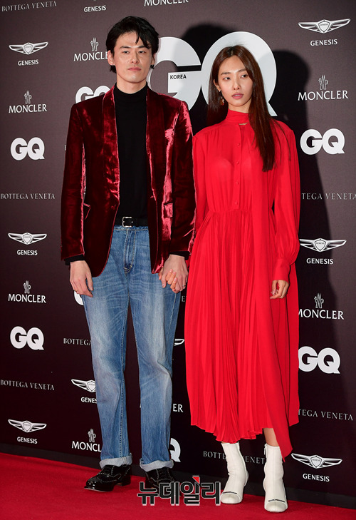 모델 김원중, 곽지영 부부가 13일 오후 서울 강남구 SJ. 쿤스트할레에서 열린 '2018 지큐 나이트(GQ NIGHT)' 기념 파티에 참석해 포토타임을 갖고 있다.