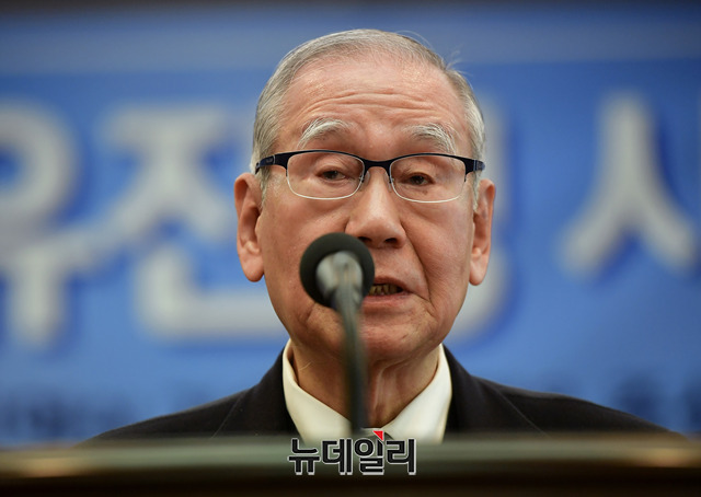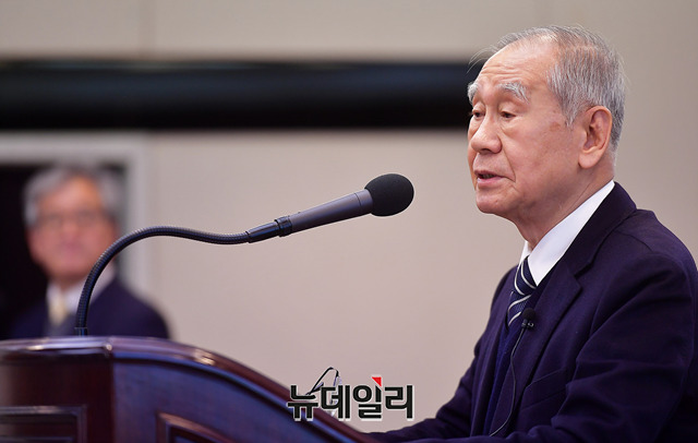 김진현 세계평화포럼 이사장이 14일 오후 서울 중구 한국프레스센터에서 열린 '대한민국 자유진영 시국 대토론회'에서 격려사를 하고 있다.