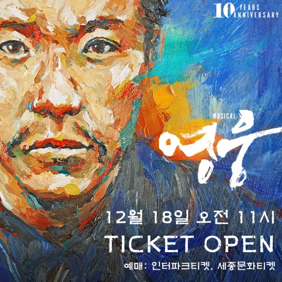 뮤지컬 '영웅'이 티켓 오픈을 진행한다.오는 18일 오전 11시부터 실시되는 1차 티켓 오픈에서는 12월 28일까지 예매하는 관객에 한해 20%의 조기예매 할인이 제공되며, 2인 이상 직계 가족이 동일 회차를 관람할 경우 30% 할인된 가격으로 구매할 수 있다.2009년 10월 초연된 '영웅'은 안중근 의사의 마지막 1년을 집중 조명해 조국을 위해 헌신한 애국지사의 면모와 운명 앞에서 고뇌하는 인간의 모습을 깊이 있게 담아낸 작품이다.한국뮤지컬대상을 비롯한 뮤지컬 시상식 총 18개 부문에서 상을 거머쥐며 창작뮤지컬 단일 작품으로는 최다 수상을 기록했다. 2019년 시즌에는 개막 10주년을 맞아 스토리 및 넘버가 부분 수정될 예정이다.2019년 뮤지컬 '영웅'에서 '안중근' 의사 역에는 배우 안재욱·정성화·양준모가 캐스팅됐으며, '설희' 역에 정재은·린지(임민지), '이토 히로부미' 역은 김도형·이정열·정의욱 등이 맡는다.2019년 3월 9일부터 4월 21일까지 공연되며, 인터파크 티켓과 세종문화티켓 유료회원의 경우 기존 시간보다 한 시간 빠른 오전 10부터 예매할 수 있다.[사진=에이콤]