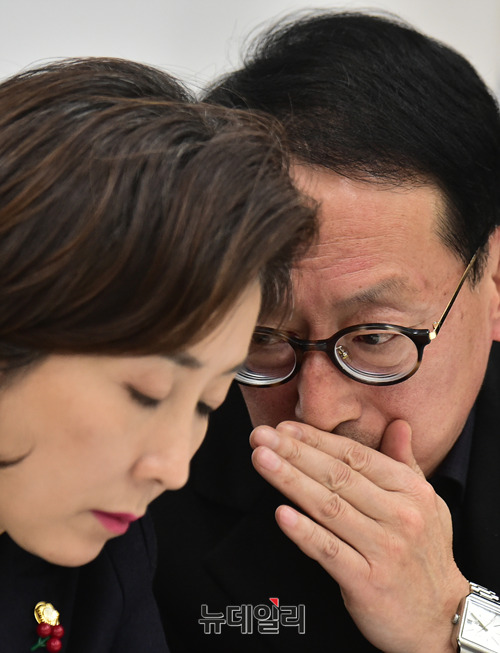 나경원 자유한국당 원내대표가 18일 오후 국회에서 열린 청와대 특별감찰반 정권실세 사찰 보고 및 불법사찰 의혹 진상조사단 회의에서 김도읍 단장과 대화를 나누고 있다.